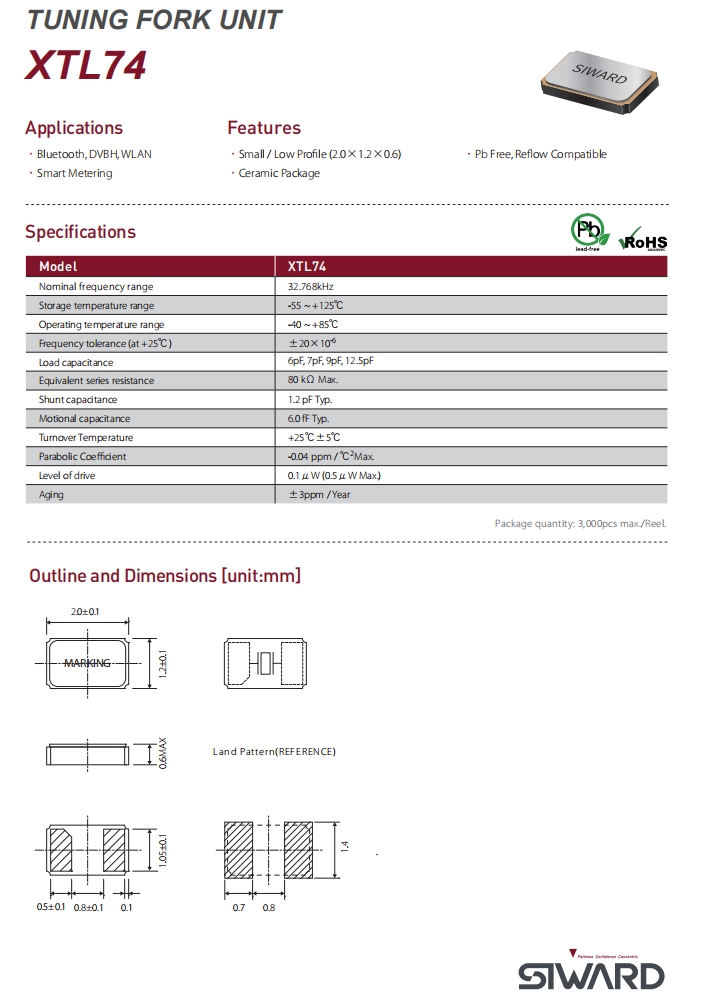 | XTL741-S999-298 | Siward | Siward | CRYSTAL 32.768 KHZ 20PPM CRYSTAL | XTL74 | 32.768 kHz | ±20ppm | 12.5pF |