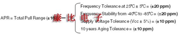 APR通過從VCXO的總穩(wěn)定性中減去總牽引范圍來計(jì)算.總牽引范圍是恒定電源電壓和溫度下,壓控振蕩器頻率隨控制電壓變化的最大變化.總穩(wěn)定性是指當(dāng)控制電壓在制造公差,電源電壓,工作溫度和老化變化范圍內(nèi)保持在標(biāo)稱值時,VCXO頻率的變化.這種差異導(dǎo)致頻率變化,這是由于控制電壓獨(dú)立于所有其他條件和變化而得到保證的.