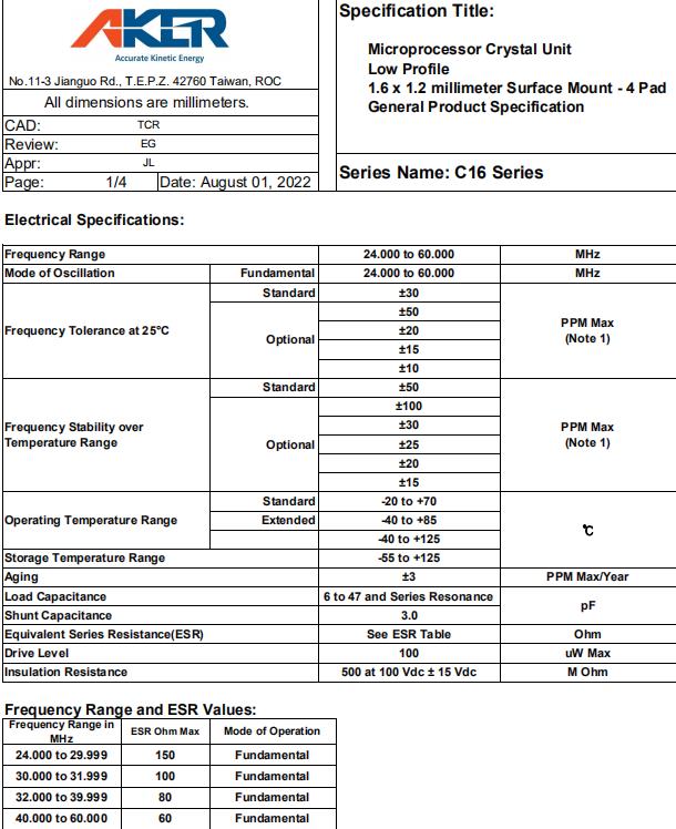 Aker Technology | 石英晶體 | Microprocessor Crystal Unit Low Profile 2.0 x 1.6 millimeter Surface Mount |