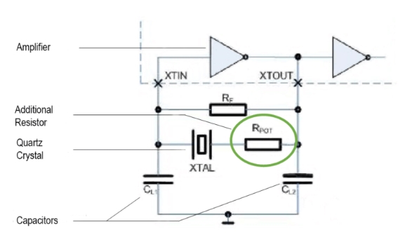 如圖1所示,電路中內置了一個新的附加電阻(RPot ),與石英串聯。然后逐步增加R電位計的電阻,直到振蕩停止。這種方法模擬“最差情況下的石英”,并揭示特定振蕩器電路中石英的最大容許阻抗。