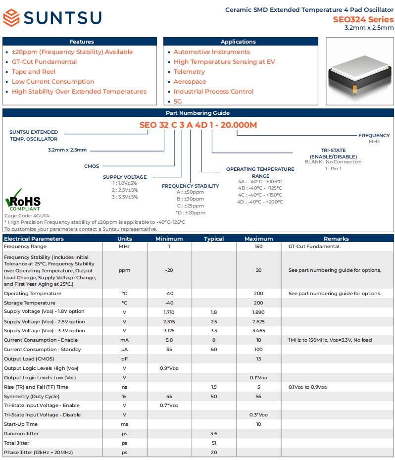 Suntsu的SEO324系列是我們產(chǎn)品線的最新成員。該石英振蕩器采用GT-cut技術(shù),可在高達約200℃的擴展溫度范圍內(nèi)實現(xiàn)高穩(wěn)定性。GT-cut振蕩器不僅能夠保持高穩(wěn)定性,而且在高沖擊和振動下性能更佳,能效更高。