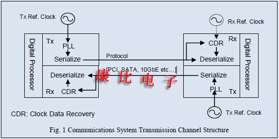 圖1顯示了一個(gè)典型的通信系統(tǒng)(傳輸信道),其中兩個(gè)收發(fā)器之間的數(shù)據(jù)轉(zhuǎn)發(fā)由多種協(xié)議(PCI,SATA,10GbE等)介導(dǎo).).在這種類型的系統(tǒng)中,有源晶振振蕩器用于產(chǎn)生參考時(shí)鐘.通常,數(shù)據(jù)在發(fā)送方被參考信號(hào)串行化,以說(shuō)明參考信號(hào)以低于數(shù)據(jù)速率的頻率振蕩.因此,發(fā)射器的內(nèi)部鎖相環(huán)(鎖相環(huán))用于將參考信號(hào)乘以所需頻率,并傳輸數(shù)據(jù).相反,在接收端,基于鎖相環(huán)的時(shí)鐘數(shù)據(jù)恢復(fù)(CDR)用于從傳輸?shù)臄?shù)據(jù)流中再生參考信號(hào),然后再生的參考信號(hào)用于重構(gòu)數(shù)據(jù).在一些高端系統(tǒng)中,接收端具有用于數(shù)據(jù)重建的嵌入式參考信號(hào).利用這種數(shù)據(jù)傳輸,信號(hào)轉(zhuǎn)換和再生是永久進(jìn)行的,并且利用高速通信,接收端必須準(zhǔn)確地將發(fā)送的數(shù)據(jù)識(shí)別為0和1.因此,如何限制實(shí)際信號(hào)的退化水平(抖動(dòng),噪聲),提高信號(hào)質(zhì)量以及如何有效地設(shè)計(jì)傳輸信道專用集成電路成為至關(guān)重要的問(wèn)題. [信號(hào)質(zhì)量評(píng)估方法]