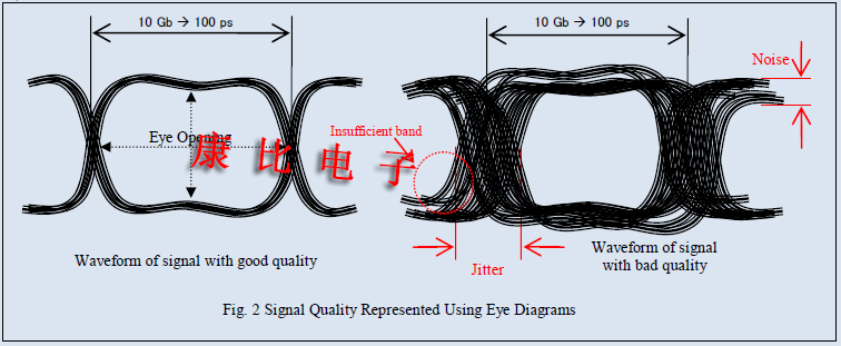 眼圖通常被用作評(píng)估通信系統(tǒng)中信號(hào)質(zhì)量的方法.這些圖表使用示波器或類似的測(cè)量設(shè)備采集高速數(shù)字信號(hào)波形的多個(gè)樣本.然后,這些波形相互疊加,形成圖形表示."眼圖"這個(gè)名字來(lái)源于類似眼睛的分層波形的視覺(jué)外觀.例如,我們將看看10GbE何時(shí)被用作傳輸信道通信協(xié)議.在該系統(tǒng)中,轉(zhuǎn)發(fā)10Gbps信號(hào)所需的時(shí)間(長(zhǎng)度)相當(dāng)于每比特信號(hào)100psec.為了評(píng)估信號(hào)質(zhì)量,信號(hào)每100psec重復(fù)一次,以獲得眼圖.例如,如果我們假設(shè)參考信號(hào)是純的,并且傳輸通道專用集成電路設(shè)計(jì)良好,那么我們將觀察到如圖2左側(cè)所示的對(duì)齊良好的波形.相反,在信號(hào)丟失的情況下,例如由具有顯著石英晶體振蕩器噪聲或抖動(dòng)的參考信號(hào)或設(shè)計(jì)不良的專用集成電路引起的傳輸信道頻帶不足,信號(hào)波形是不穩(wěn)定的,波形的分層導(dǎo)致如圖2右側(cè)所示的"閉眼"類型.將信號(hào)數(shù)據(jù)識(shí)別為0或1在很大程度上依賴于眼睛睜開(kāi)的水平和垂直方向