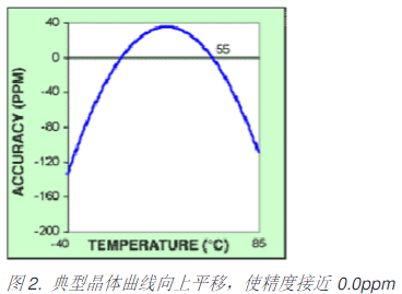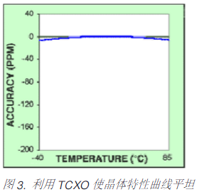 另一種有效提高計(jì)時(shí)精度的方法是使用具有溫度補(bǔ)償?shù)?strong>32.768KHZ晶體振蕩器(TCXO),如DS32kHz,作為獨(dú)立的RTC時(shí)鐘源。這種器件經(jīng)過(guò)工廠(chǎng)校準(zhǔn),在擴(kuò)展工業(yè)級(jí)溫度范圍內(nèi)(-40°C至+85°C)能夠提供±7.5ppm的精度。TCXO的作用是將晶體拋物線(xiàn)變得平坦(圖3)。