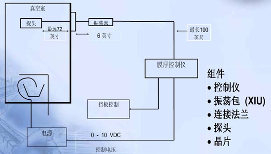 膜厚控制儀用電子組件引起晶振片的高速振動,約每秒6百萬次(6MHz),鍍膜時,測試每秒鐘振動次數的改變,從所接受的數據中計算膜層的厚度。為了確保晶振片以6MHz的速度振動,在真空室外裝有“振蕩器”,與晶控儀和探頭接口連接,振蕩器通過迅速改變給晶振片的電流使晶振片高速振動。